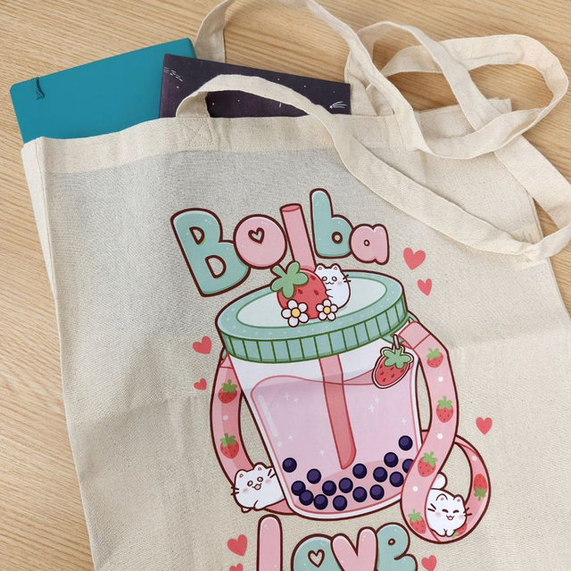 Diese süße Tasche ist der perfekte Begleiter für deinen Alltag. Mit ihren zwei langen Henkeln ist sie ideal zum Einkaufen oder zum Transportieren deiner wichtigsten Dinge. Der kawaii Bubble Tea-Druck macht sie zu einem echten Hingucker und ist langlebig. Diese große Tasche hat Seiten-und Bodenfalten und kann damit sogar mehr Inhalt als eine normale Tote Bag tragen!