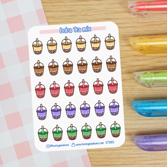 Ein Stickerbogen für alle Bubble Tea-Fans! Dekoriere dein Bullet Journal, deinen Planer oder dein Scrapbook mit bunten Boba-Aufklebern in den Geschmacksrichtungen Kaffee, Granatapfel, Taro, Soda oder Milchtee!