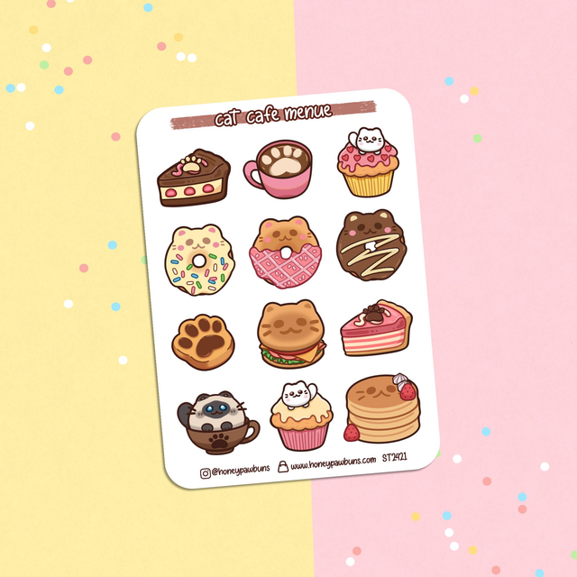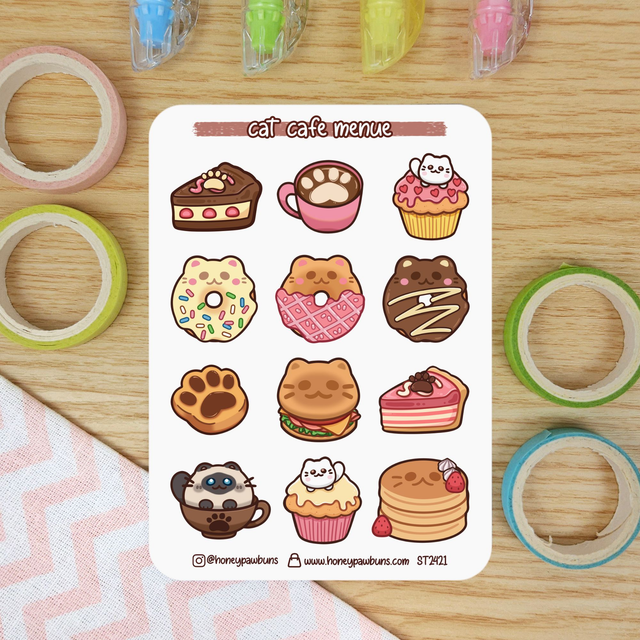 Wilkommen im Katzen Cafe! Ein Stickerbogen voll mit leckeren Sandwiches, Kuchen und Donuts, natürlich mit Katzenmotiven. Dieser Aufkleber sind etwas größer als unsere üblichen Journal Sticker. Perfekt um deine Planer Seiten mit kawaii und cozy Vibes zu füllen!