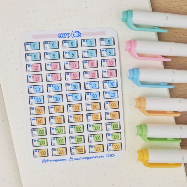 Diese Sticker sehen aus wie Euroscheine, aber mit einem süßen Twist! Mit ihren Pastellfarben sehen sie einfach mega kawaii aus. Und sind perfekt um das eher trockene Thema Buchhaltung und Budgetplanung in deinen Planer aufzupeppen!