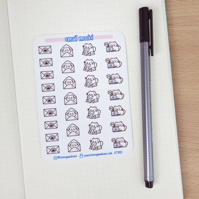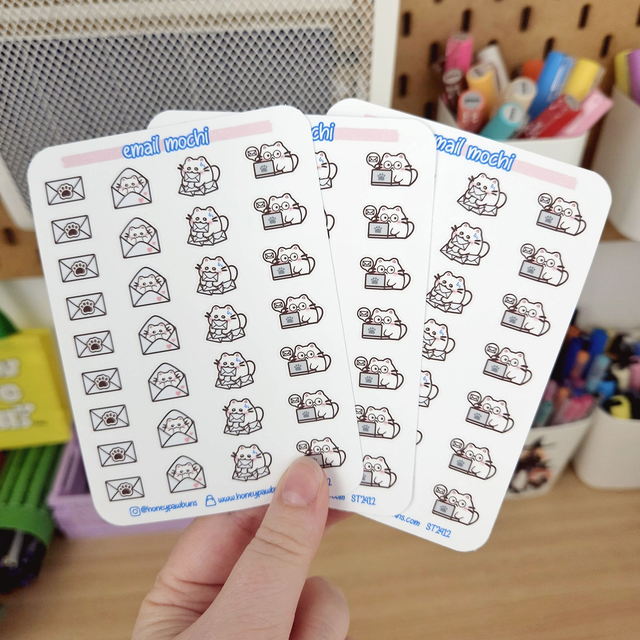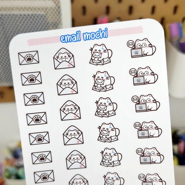 Mochi räumt ihren E-Mail-Posteingang auf! Wenn du auch bei der Arbeit viele E-Mails beantworten musst, sind diese kleinen Aufkleber perfekt, um deine E-Mail-Zeit zu markieren! Oder um auf witzige Art diesen Punkt auf deiner To Do-Liste hervorzuheben.